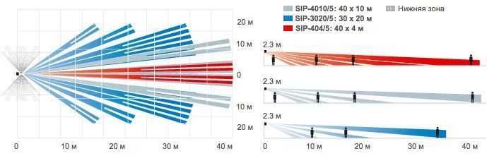 | Область детекции | 30×20 м (74 зоны детекции) | 40×10 м (48 зон детекции) | 40×4 м (24 зоны детекции) |
